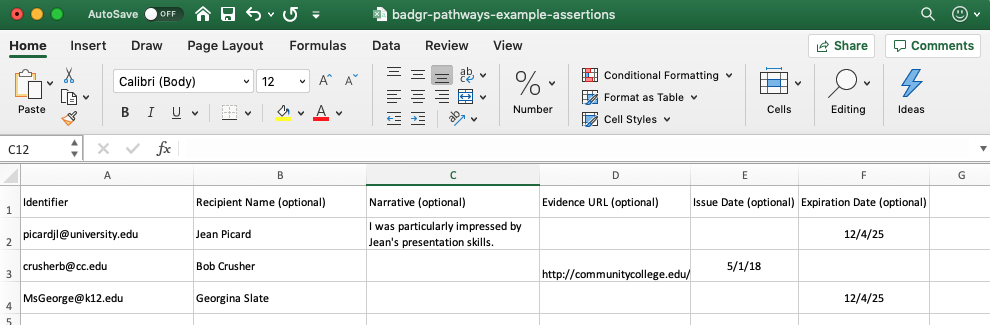 Badgr allows program administrators to award badges (in bulk) to a group of recipients. You may include optional metadata such as evidence and narrative to the badge(s) that may the same or specific to each user.