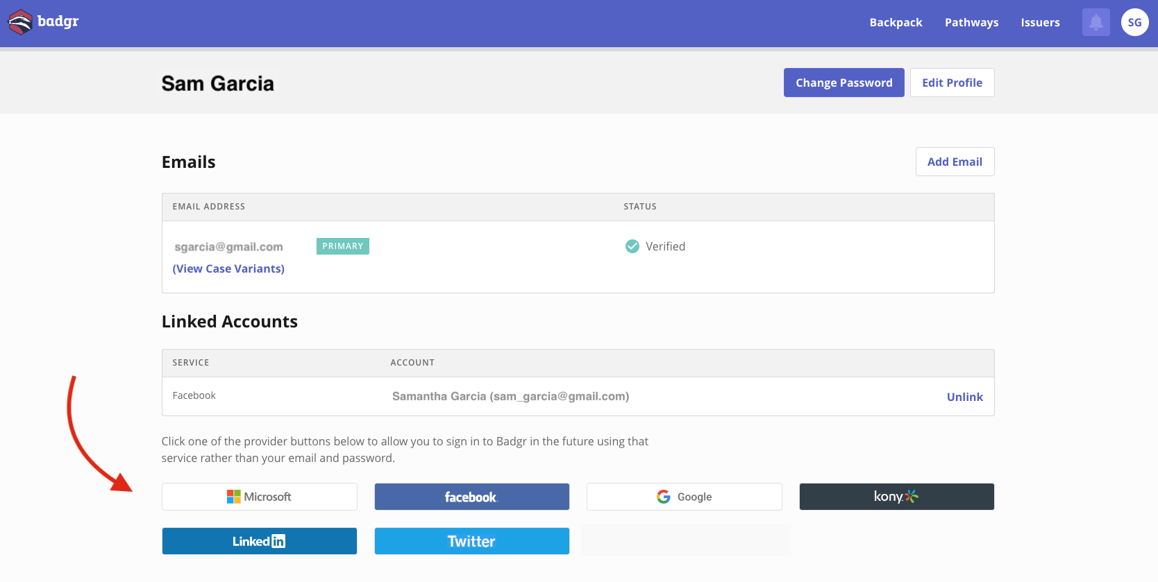 At the bottom of the page, click one of the provider buttons to integrate the SSO and allow you to sign-in to Badgr using the SSO rather than the user's Badgr account credentials. Users can currently integrate SSO's for Facebook, LinkedIn, Google, Microsoft, and Kony. If you are interested in adding the Twitter SSO or awarding badges using Twitter see our Using Twitter with Badges knowledge base article.